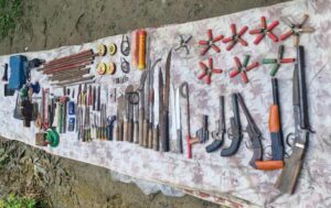 উদ্ধারকৃত অস্ত্র ও সরঞ্জামাদির মধ্যে ৬টি স্থানীয়ভাবে তৈরি আগ্নেয়াস্ত্র, ৩৫ রাউন্ড খালি কার্টুজ, ৫ রাউন্ড ভরা কার্টুজ, ১টি চায়নিজ কুড়াল, ২০টি দা, ২টি ওয়াকি-টকি ও চার্জার,১টি মাইক (মেগাফোন), ৪টি প্যারাশুট ফ্লেয়ার,অস্ত্র নির্মাণে ব্যবহৃত অন্যান্য সরঞ্জাম ও যন্ত্রপাতি।